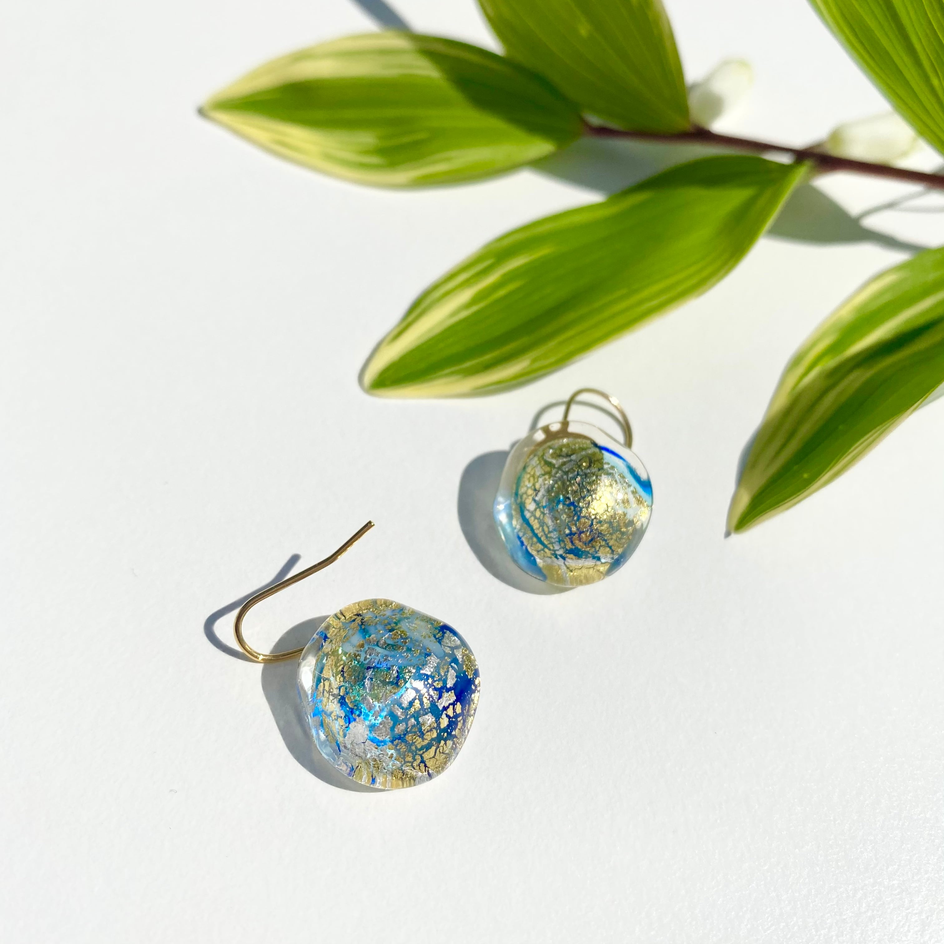 スカイブルーに金箔、そして銀箔を 重ね合わせたピアスです。 柔らかな形に仕上げています。 1.5cm〜2cmでお作りしています。 プレゼントでのご用意も可能です。 ご購入の際、メッセージにお書きください。 ※普通のピアスと違い、少し重たく感じることがあります。 ※全て手作りな為、ペアを全く同じにお作りすることができませんので、ご了承下さいませ。